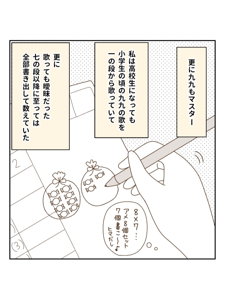 九九は8×7だったら8個入りのアメを7袋書いて